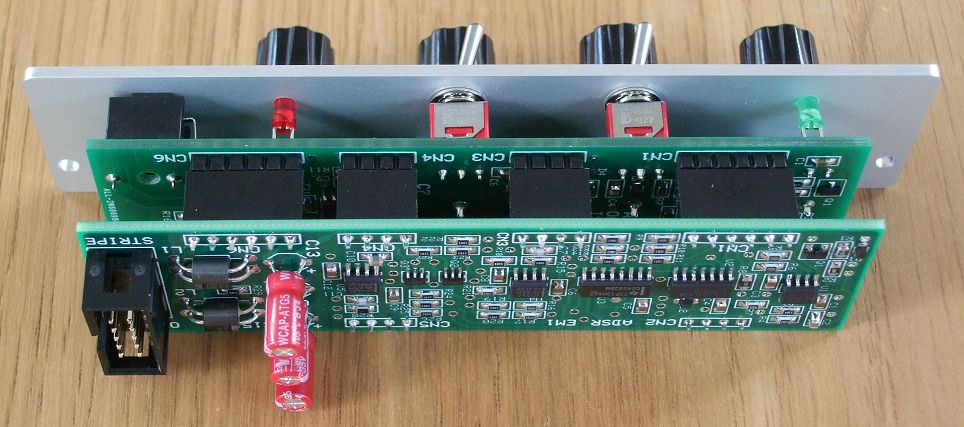 The Envelope module comprises of two printed circuit boards (PCBs) connected together with six 0.1 (2.54mm) single in line (SIL) headers and sockets. The main board on the rear of the module houses the power input and conditioning, and the ADSR core. The pot board has the pots, switch, and sockets that are attached to the front panel, as well as the gate input, LED drivers, and output circuitry. The main board is a four layer design, while the pot board is a two layer design. Each board is the same size; 29 mm x 107 mm.