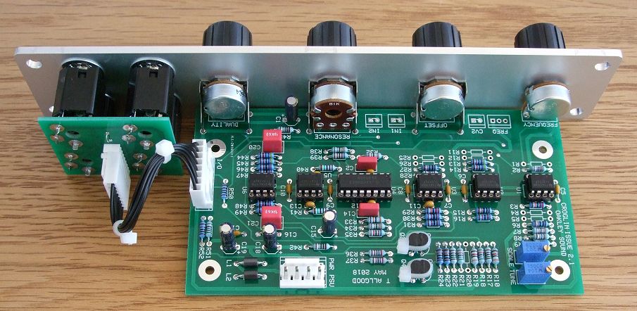 The issue 2.1 Croglin 'Filter Core' VCF as a single width MOTM format module in a natural finish Schaeffer panel. Note also the use of the optional Sock4 socket board to help keep the wiring to the sockets neat and tidy. The empty resistor and header locations are used in the 2U wide full version.