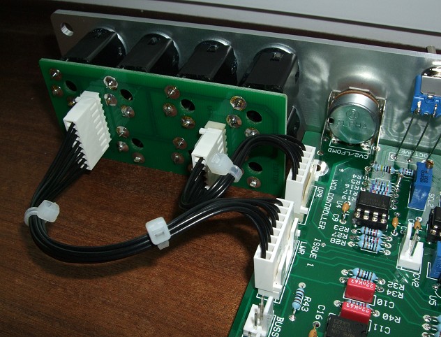 The original issue 1 VCO Controller board with optional Sock8 board. Issue 2 boards are similar. The Sock8 makes wiring the sockets very easy. The optional Bus1 and Bus2 headers connect to the midiDAC's buss output or to the system Dizzy board. The CV1 and CV2 three way headers in the middle of the board go to the VCO bus inputs.