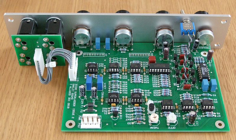 The Diode Superladder VCF features both voltage control over frequency and resonance. Unique to any diode ladder filter is has a variable shape output. This incorporates a feature first seen on the Oakley Orbital prototypes. A single pot allows you to vary the output from one (or two) pole low pass to four (or five) pole low pass via band pass in the middle.