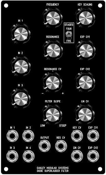 This is the suggested panel design for the 3U version of the Diode Superladder. This is a fully featured filter module that includes inbuilt CV and audio mixer sections.
